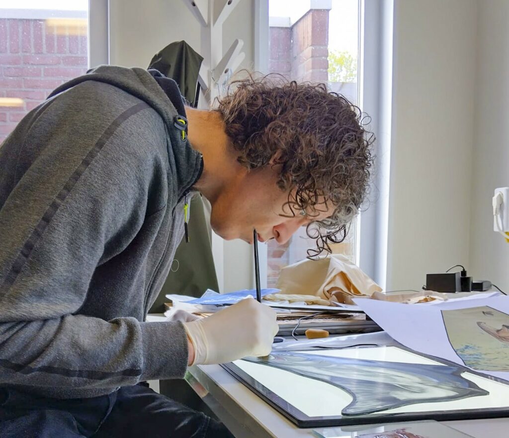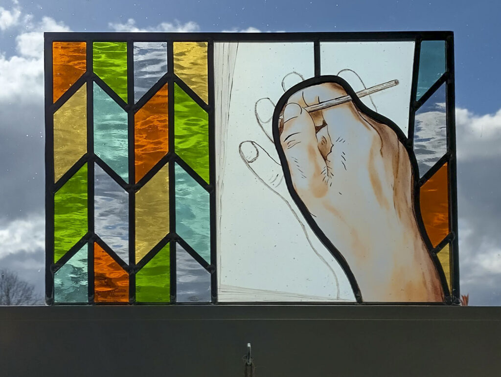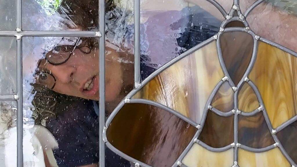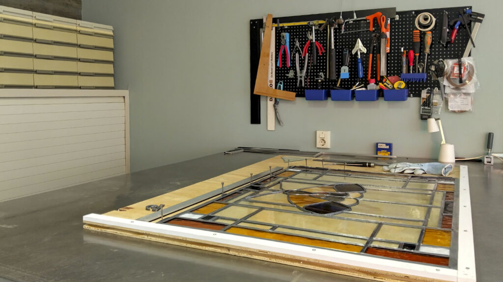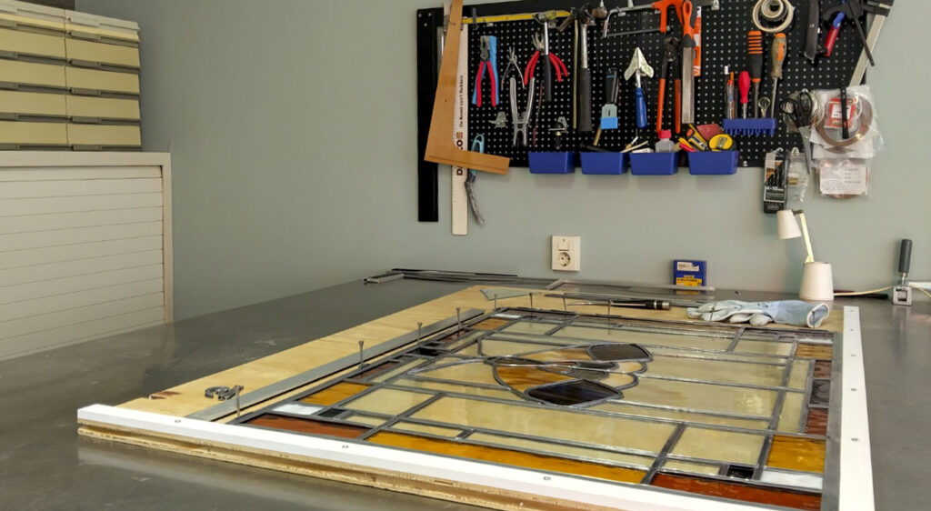 Het bestaande raam word uit het venster gehaald en naar het atelier gebracht. Hier haal ik het helemaal uitelkaar, en maak het glas schoon. Als er een stukje glas gebroken is probeer ik een nieuw stukje te vinden, wat zo dicht mogelijk bij het bestaande komt. Het raam kan nu opnieuw in het lood worden gezet, waarna het weer jaren mee kan. Dit is ook het moment om na te denken over duurzaamheid. Denk aan dubbel glas of voorzet ramen.